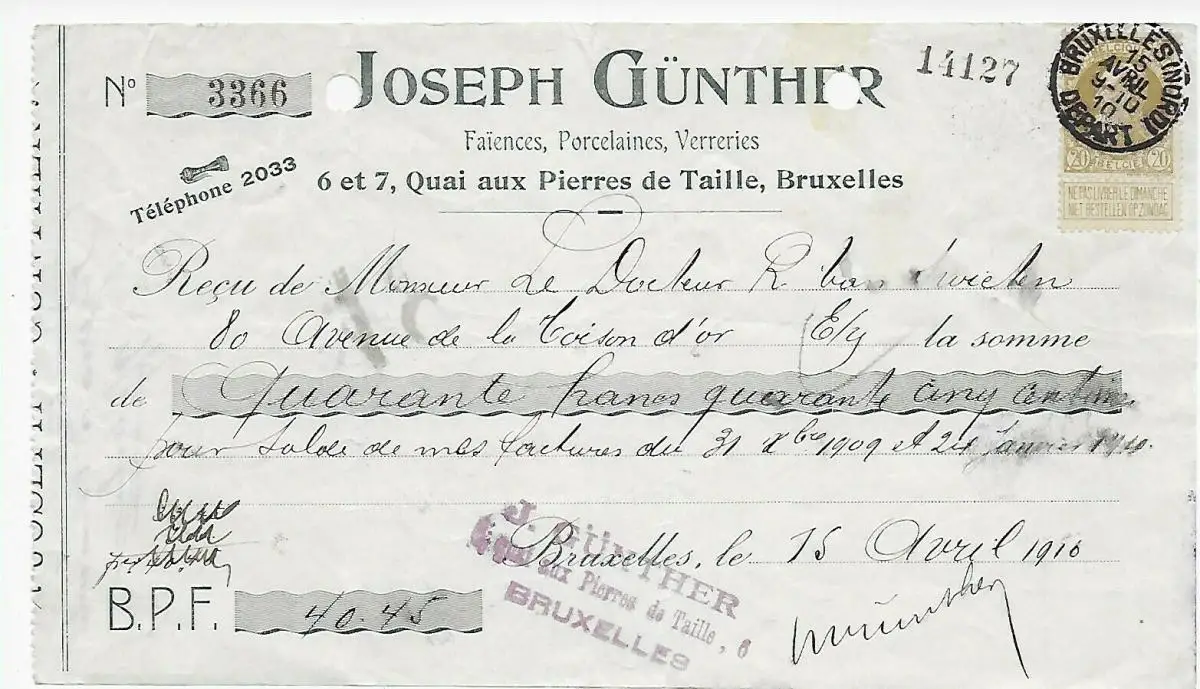 Belgien: 15.4.1910: Scheckeinreichung, Brüssel