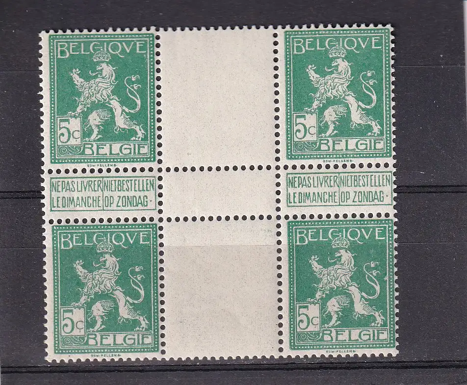 BELGIEN BELGIE BELGIQUE 1912 5c/ Mi 90 4er BLOCK ** INTERPANNEAU/ POSTFRISCH/ NEUF/ POSTFRIS