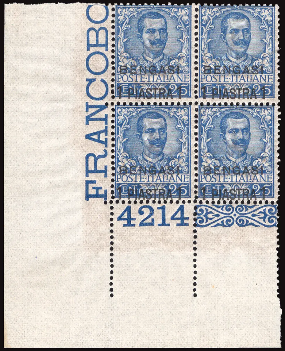 MNH - Vollgummi - - Bengasi - Floral 1 P. auf ca. 25 Nr.1 wunderschönes Viertel a. von f. mit Tischnummer 4231 - Luxusqualität für Frische und Zentrierung - Kat. euro 2.800 ++ Cod.995/182