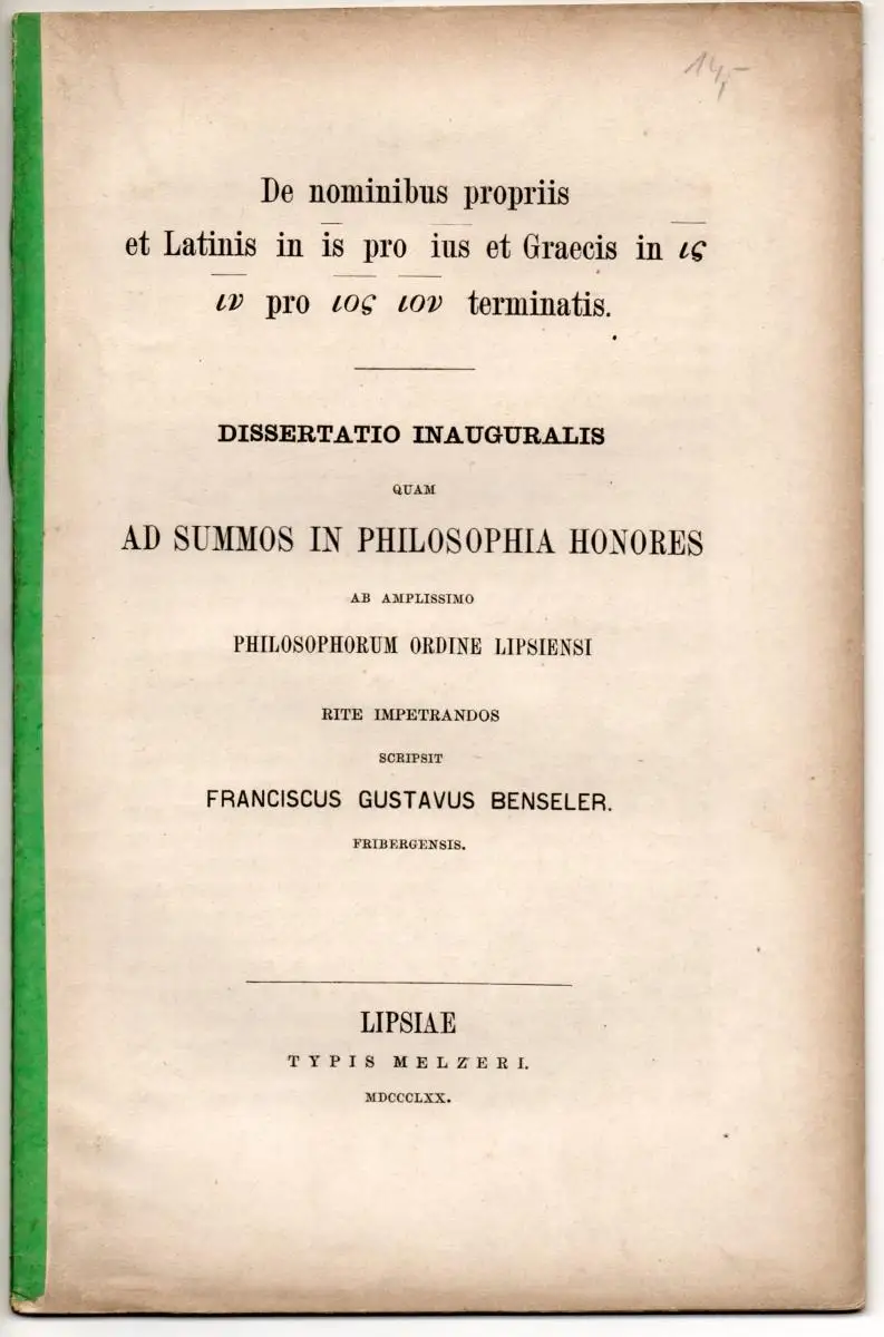 Benseler, Franz Gustav: aus Freiberg: De nominibus propriis et Latinis in is pro ius et Graecis in is in pro ios ion terminatis. Dissertation.