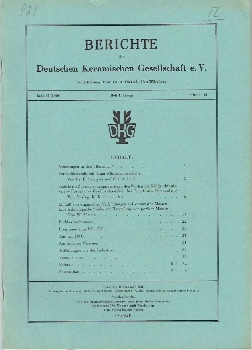 guter bis sehr guter Zustand, geringe Gebrauchs- und Alterungsspuren: Umschlag und Seiten teils etwas eselsohrig, oben intensiver - Seiten sonst sauber und ordentlich - Rücken etwas beschabt und gering durchgewetzt, Neuerungen in den "Berichten" - Forsteritkeramik mit Titan-Wärmedehnverhalten Von Dr. E. Singer und Chr. Adolf - Statistische Zusammenhänge zwischen den Werten für Kaltdruckfestigkeit ? Porosität ? Gasdurchlässigkeit bei feuerfesten Erzeugnissen Von Dr.-Ing. K. Konopicky - Einfluß von organischen Verbindungen auf keramische Massen Eine technologische Studie zur Herstellung von porösen Massen Von W. Mann - Buchbesprechungen - Programm zum VII. CIC - Aus der DKG - Aus anderen Vereinen - Mitteilungen aus der Industrie - Verschiedenes - Referate - Patentschau, kartoniert, ca. 21 x 29,5, 48 Seiten mit einigen Bildern und weiteren 8 Reklameseiten