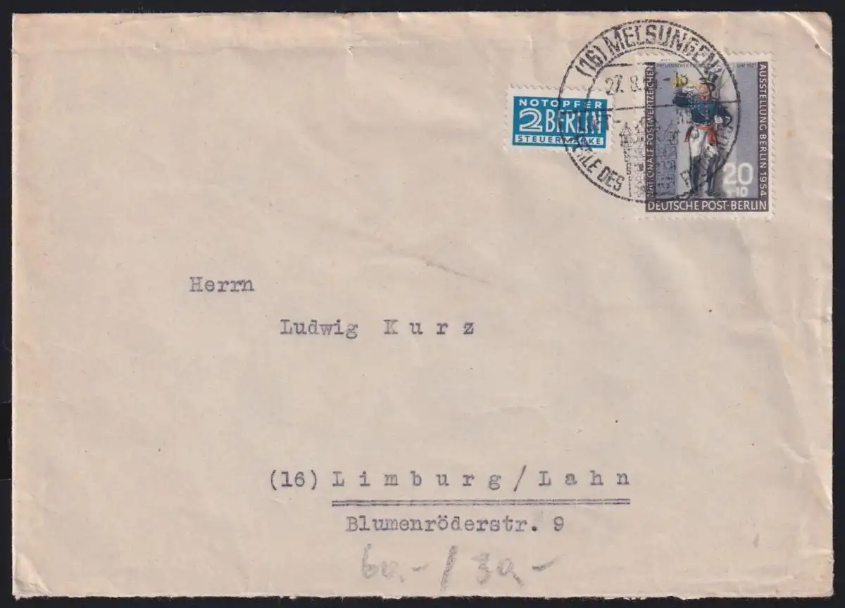 20 Pfennig Postillion als portogerechte Einzelfrankatur auf Brief von Berlin am 27.8.1955 nach Limburg gelaufen.