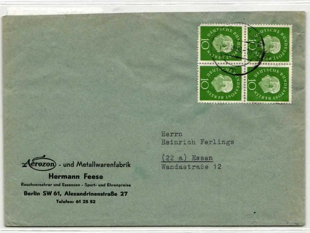 10 Pfennig Heuss Bogenpaar im 4er-Block als portogerechte Mehrfachfrankatur auf Brief 2. Stufe von Berlin am 2.11.1960 nach Essen gelaufen.