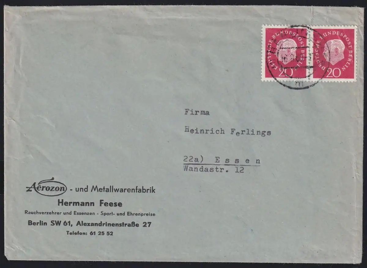 20 Pfennig Heuss als portogerechte Mehrfachfrankatur auf Brief 2. Portostufe am 16.8.1960 von Berlin nach Essen gelaufen.
