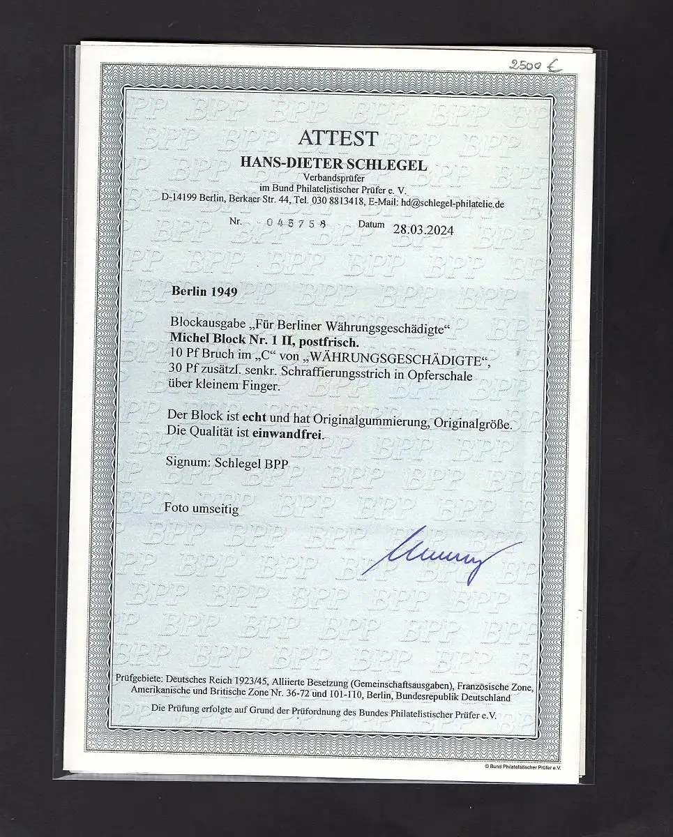 Berlin 1949, Blockausgabe, Mi-Nr. Block 1 II, postfrisch, FA SchlegelBPP.