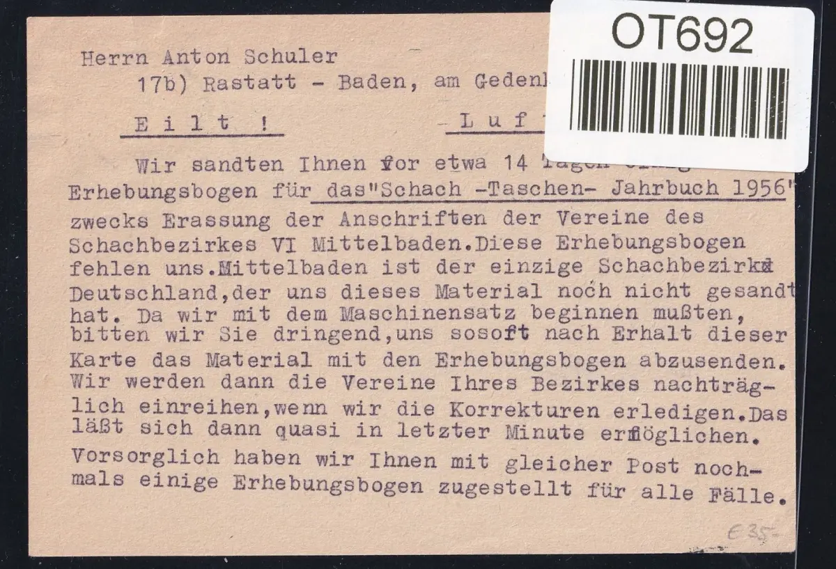 15 Pfennig Bauten als Einzelfrankatur auf Luftpostkarte portogerecht am 29.10.1955 von Berlin Frohnau nach Rastatt gelaufen.