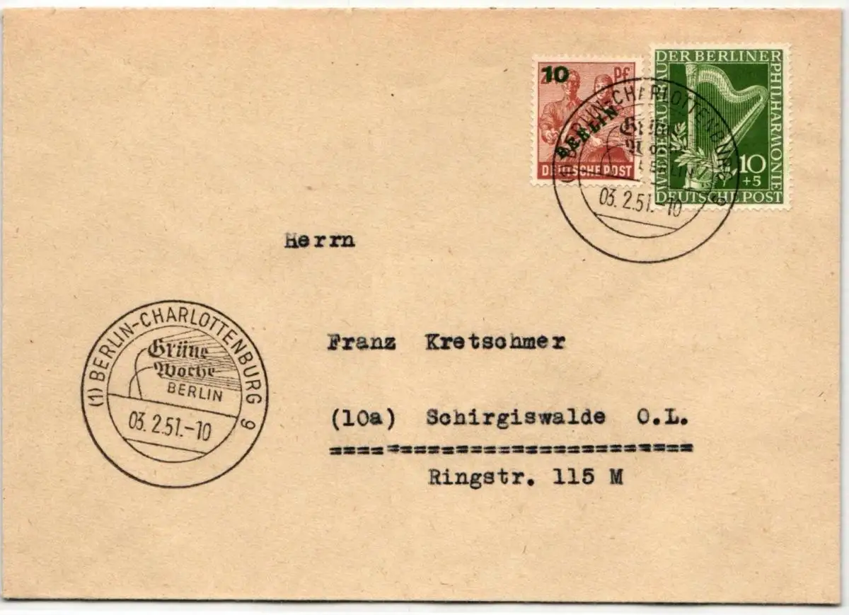 10 Pfenning "Philharmonie" in Kombination mit 10 Pgenning "Grünaufdruck" als portogerechte Mischfrankatur auf Fernbrief von Berlin am 3.2.1951 nach Schirgiswalde gelaufen. Mit Sonderstempel der Grünen Woche.