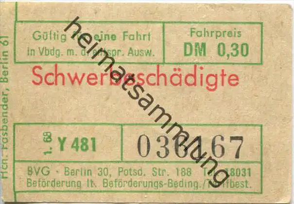 Berlin - BVG - Fahrschein 1968 - Schwerbeschädigte - DM 0,30
