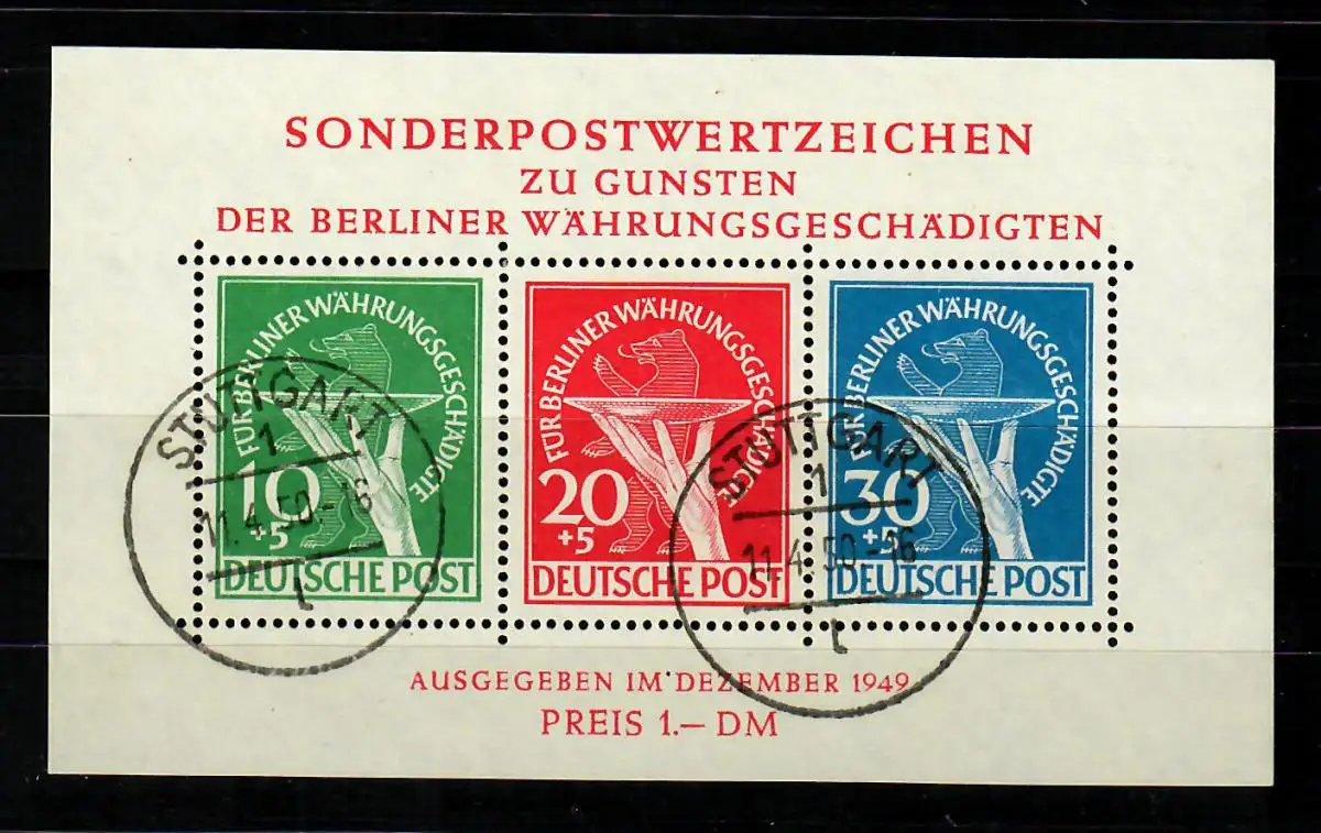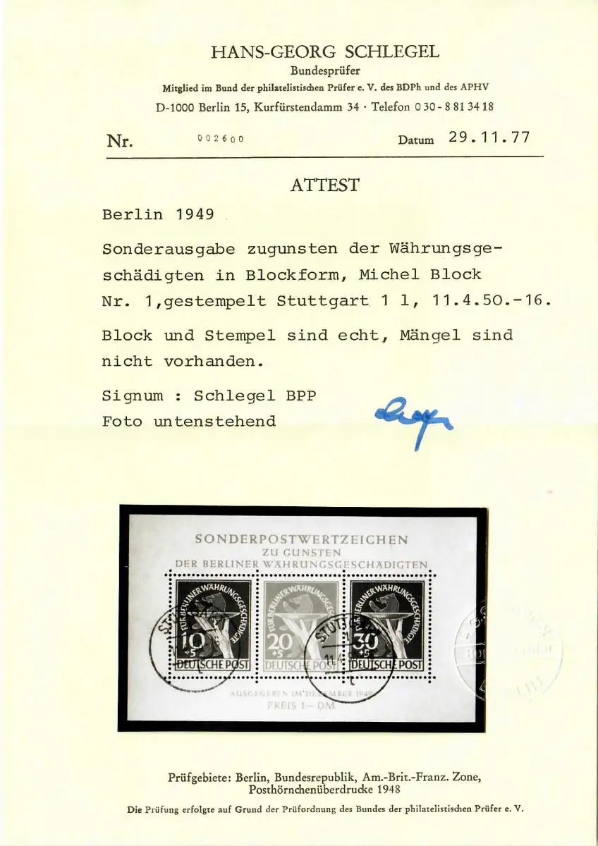 Berlin Block 1, gestempelt Stuttgart 1950, BPP Attest