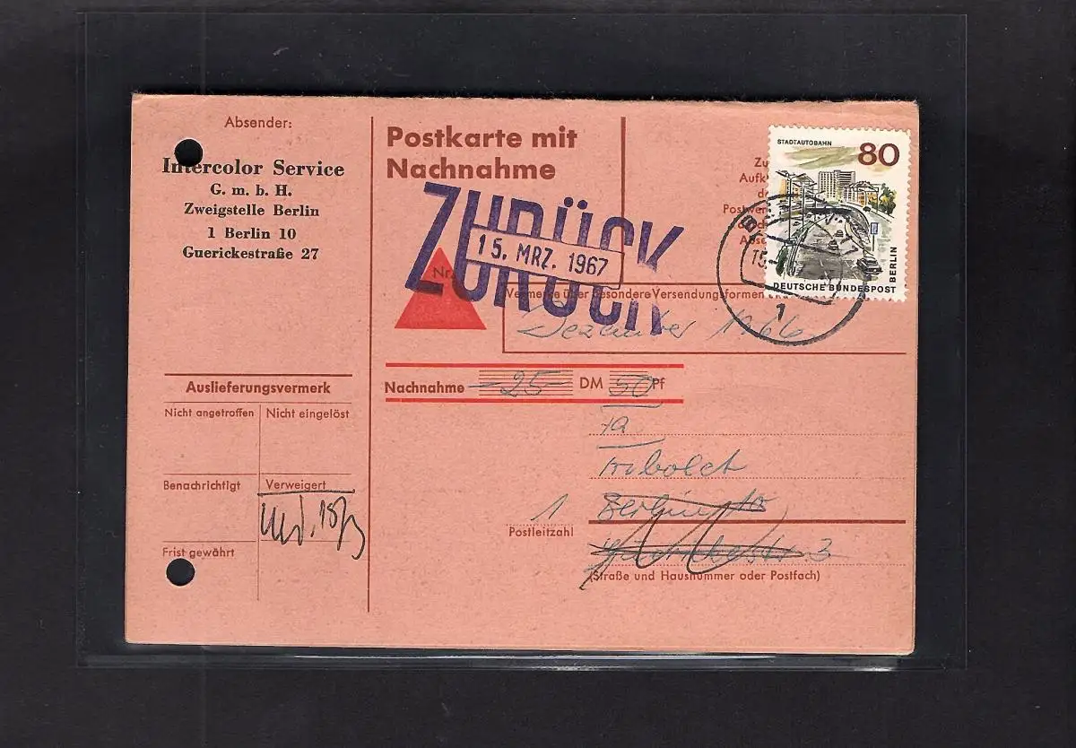 Berlin, EF. Mi.-Nr. 262 auf Nachnahme-Postkarte.