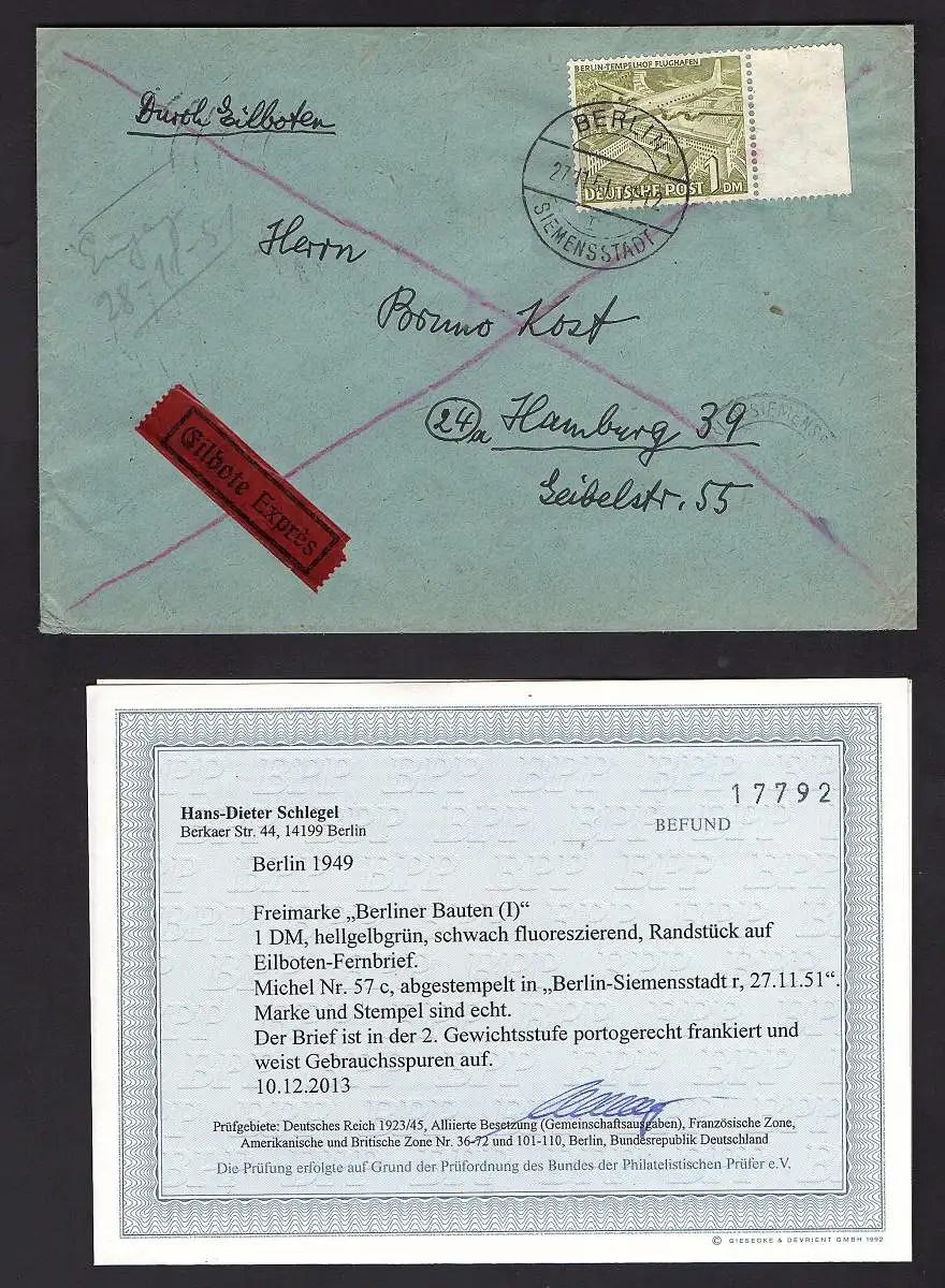 Berlin, Eilbote-Fernbrief mit EF. Mi.-Nr. 57 c Befund.SchlegelBPP:
