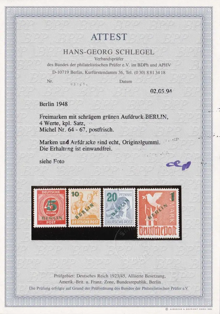 Berlin: MiNr. 64-67, postfrisch, BPP Attest