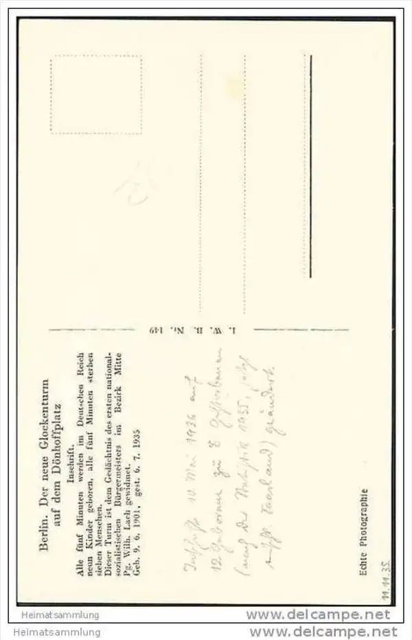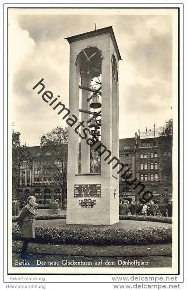 Berlin-Mitte - Der neue Glockenturm auf dem Dönhoffplatz - Foto-AK - Inschrift: Alle fünf Minuten werden im Deutschen Reich neun Kinder geboren - alle fünf Minuten sterben sieben Menschen. Dieser Turm ist dem Gedächtnis des ersten nationalsozialistischen Bürgermeisters im Bezirk Mitte Pg. Wilh. Lach gewidmet. Geb. 9.6.1901 - gest. 6.7. 1935 - rückseitig zwei Klebepunkte (G19351) *