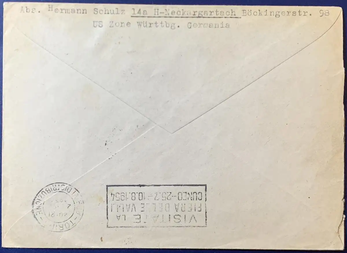 Bedarfsbrief, Bund nach Italien, frankiert mit Berlin, Mi.Nr. 92 + 98, gelaufen mit Poststempel vom 01.07.1954 von Heilbronn nach Turin/Italien.