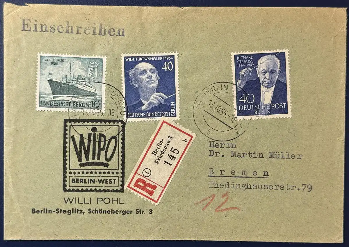 Bedarfsbrief, Berlin, Einschreiben, 1955, Mischfrankatur, Berlin Mi.Nr. 124, 126 und 128, gelaufen mit Poststempel vom 13.10.1955 von Berlin nach Bremen. Sehr gut erhalten, saubere, gut lesbare Stempel.