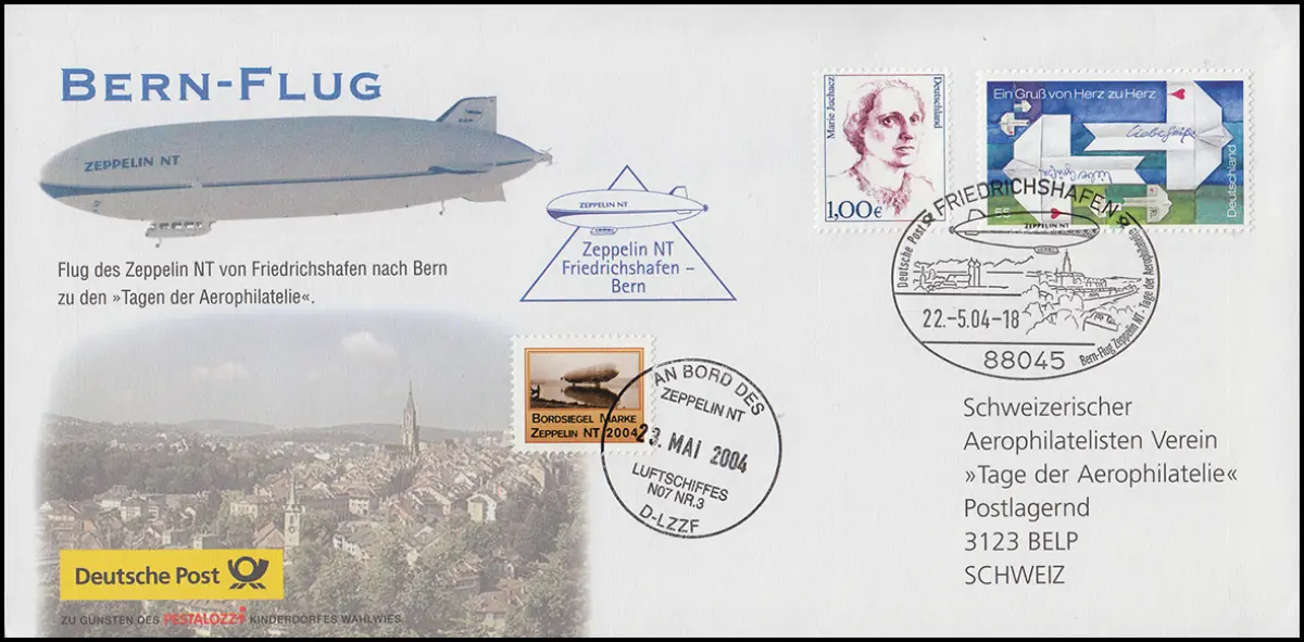 Bern-Flug des Zeppelin NT Luftschiff D-LZZF von Friedrichshafen nach Bern zu den "Tagen der Aerophilatlie" mit Bordsiegelmarke NT 2003, rückeitiger Ankunftstempel SSt BELP 22. bis 23. Mai 2004 - DKL 96 Bern (CH) Friedrichshafen (D) Zeppelin NT 23.5.2004.