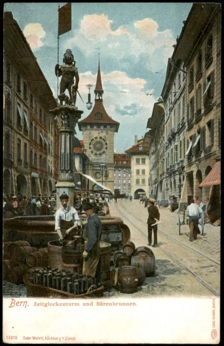 Bern (Schweiz) Berne Zeitglockenturm und Bärenbrunnen, belebte Strasse 1910