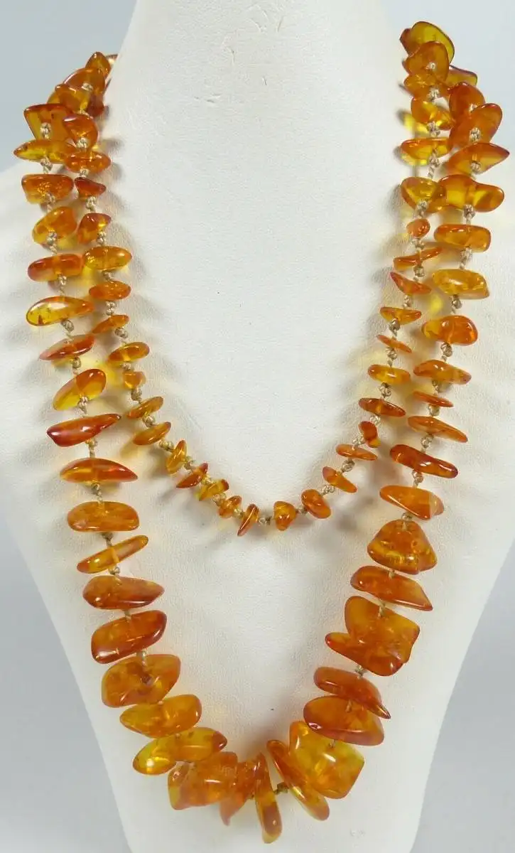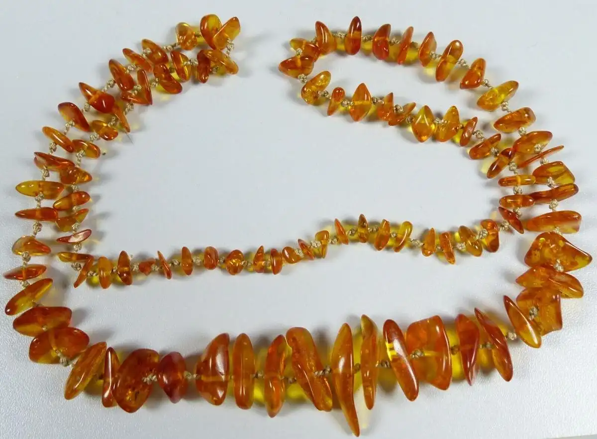 Bernstein/Amber-KetteLänge der Kette 72 cm, Größe der Glieder von 2,7 mm x 6,2 mm bis 6,3 mm x 16,4 mmGewicht ca. 27,8Grammin guter Erhaltung, nicht gereinigt.