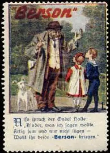 Also sprach der Onkel Nolte: Kinder, was ich sagen wollte. Artig sein und nur nicht lügen - Wollt ihr beide Berson kriegen. Hund, Größe/Zustand: 6x4 , guter Zustand, Original alte Reklamemarke die seinerzeit für die Werbung benutzt wurde