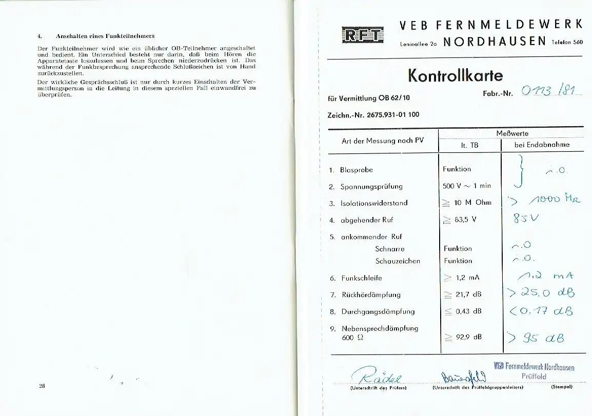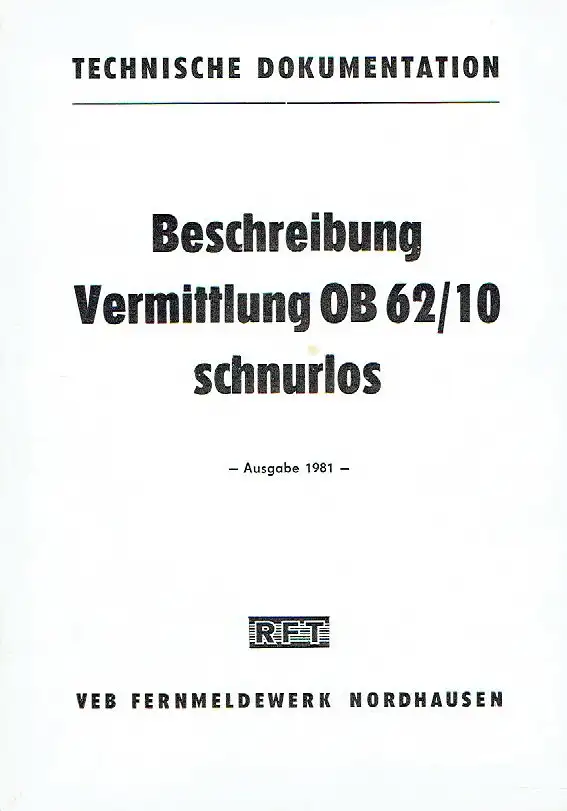 sehr guter Zustand, geringe Gebrauchs- und Alterungsspuren: Seiten teils etwas eselsohrig, Verwendung - Prinzip der Vermittlung OB 62/10 - Grundsätzliche Wirkungsweise - Technische Aufgaben - Maximaler Verbindungsaufbau - Ankommender Ruf - Abgehender Ruf - Sonstige elektrische Werte - Stromversorgung - Zubehör - Abmessungen und Gewicht - Klimaeigenschaften - Transportbedingungen - Einsatzmöglichkeiten - als Einzelvermittlung -  in Verbindung mit einer Funkstation - Vermittlung eines Amtsteilnehmers mit den übrigen OB-Teilnehmern - in Verbindung mit der Anlage OB 62/20 - in Verbindung mit einer Anlage OB 52 - Aufbau des Vermittlungsschrankes - Mechanischer Aufbau des Gerätes - Verdrahtung des Gerätes - Beschreibung des Stromlaufplanes - Kurzzeichen-Übersicht — Teilnehmer-Kassette - Lageplan — Teilnehmer-Kassette - Kurzzeichen-Übersicht — Schlußzeichen-Kassette - Lageplan — Schlußzeichen-Kassette - Kurzzeichen-Übersicht — Rückwand — vollständig - Lageplan — Rückwand - Kurzzeichen-Übersicht — Einsatz — vollständig - Lageplan — Einsatz — vollständig - Bedienungsanweisung — Vermittlung OB 62/10 — schnurlos - Kontrollkarte (ausgefüllt) - Garantieurkunde (ausgefüllt) - Vermittlungsschrank 10 — schnurlos (Anlage: Schaltplan), kartoniert, ca. 15 x 21, 28 Seiten mit 4 Bildern und 1 Anlage: Schaltplan