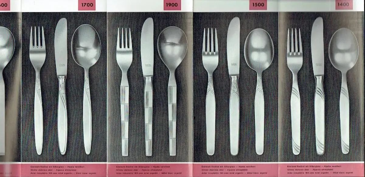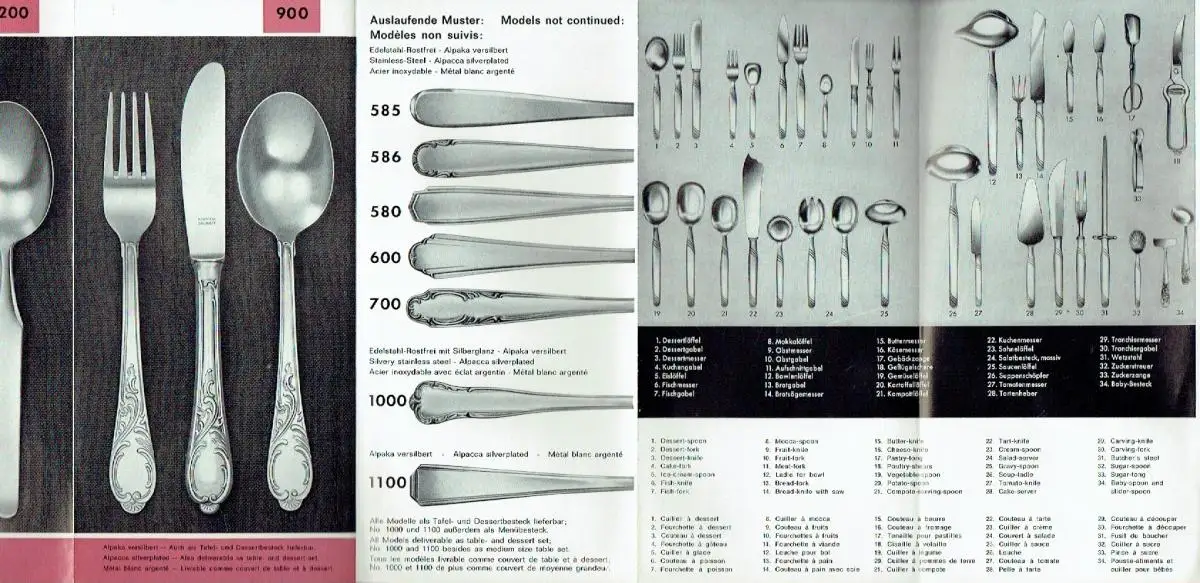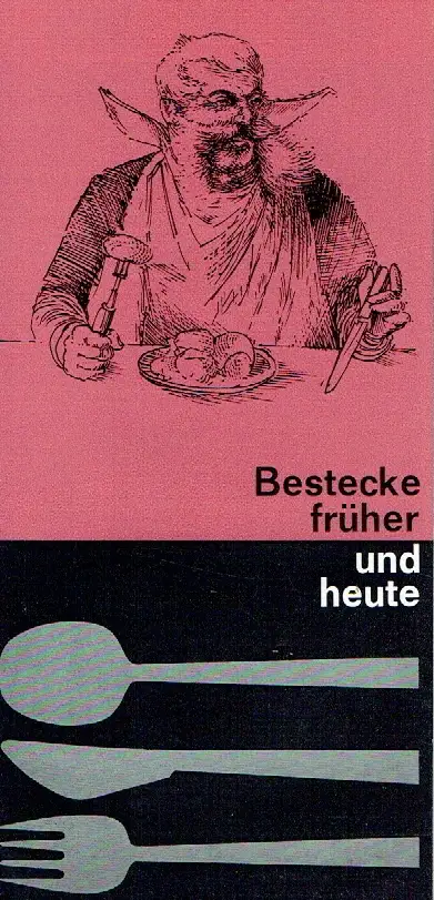 sehr guter Zustand, geringe Gebrauchs- und Alterungsspuren, kleiner Prospekt ohne Angaben zu Herausgeber oder zur Zeit: allerdings tragen alle Bestecke die Aufschrift "Rostfrei, Solingen", die Marke Solingen ist möglicherweise der Herausgeber, das Jahr habe ich geschätzt, beides ohne Gewähr, Papier, ca. 10 x 21 (aufgeklappt ca. 70 x 21), 13 Seiten mit zahlreichen Bildern