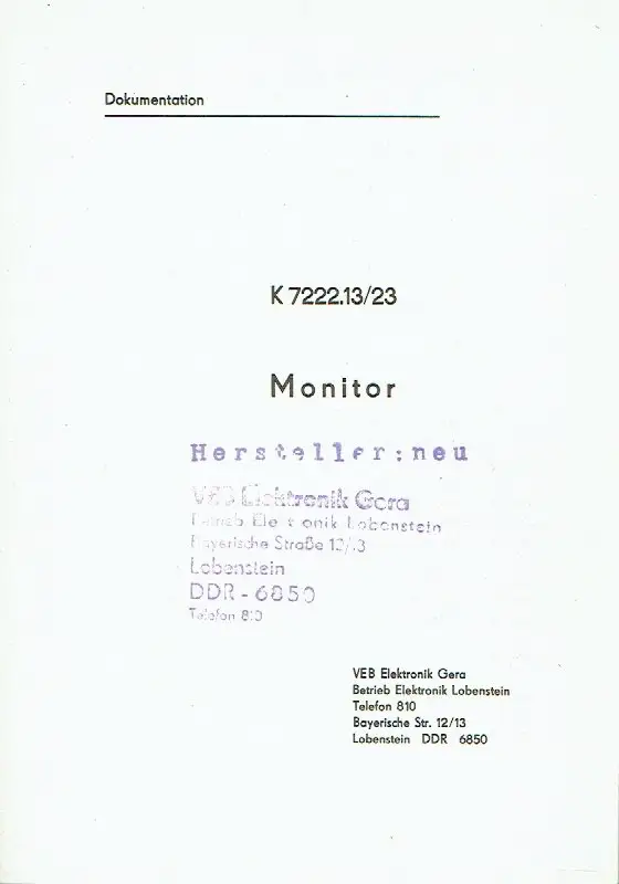 sehr guter Zustand, geringe Gebrauchs- und Alterungsspuren, Einleitung - Sicherheitsmaßnahmen - Erstinbetriebnahme - Bedienung - Wartung und Reparatur - Lagerung und Transport - Anlagen - Monitor K 7222.13 - Monitor K 7222.23 - Ersatzteilliste - Strahlenschutzbauartzulassung SBZ 171283 - 5 Beilagen K 7222.13/23 - Technische Beschreibung 1-5, kartoniert, ca. 14,5 x 20,5, 30 Seiten mit 12 Bildern + 5 Beilagen auf Mikroplanfilm