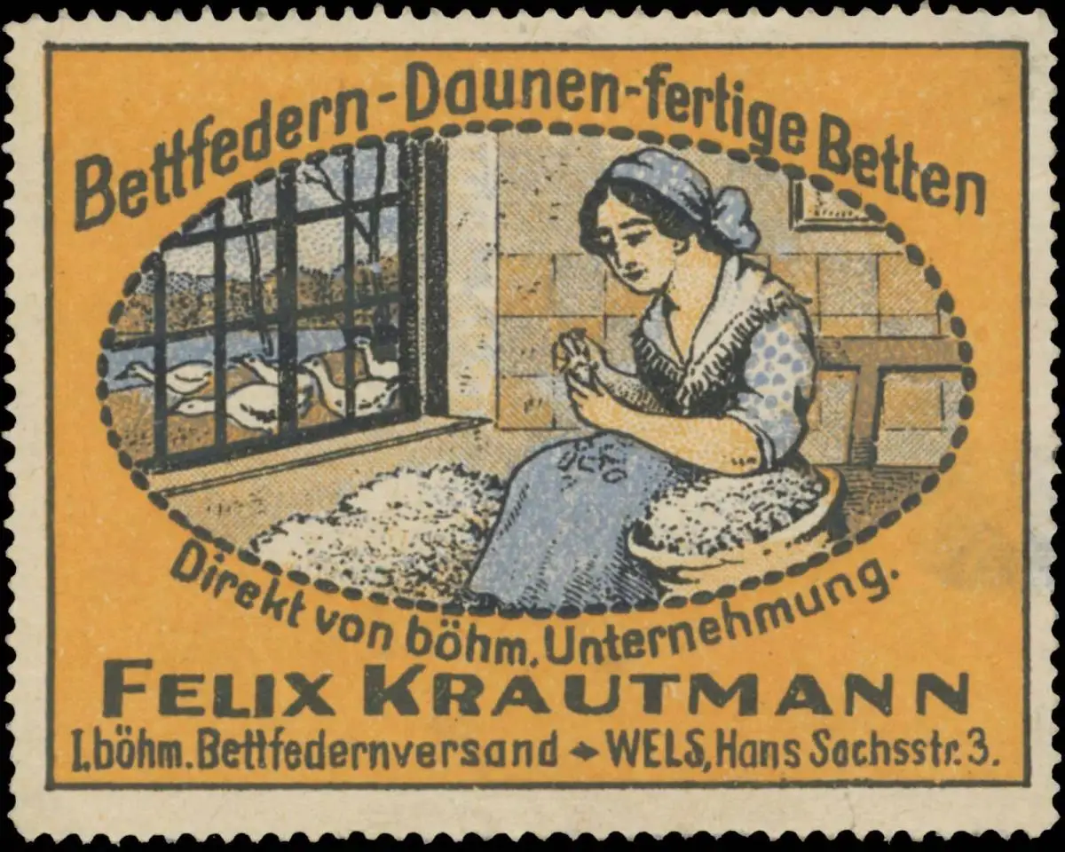 fertige Bessten direkt von böhmischer Unternehmung, I. böhmischer Bettfedernversand, Wels, Hans Sachs Straße 3, Größe/Zustand: 5x6 , guter Zustand, Original alte Reklamemarke die seinerzeit für die Werbung benutzt wurde