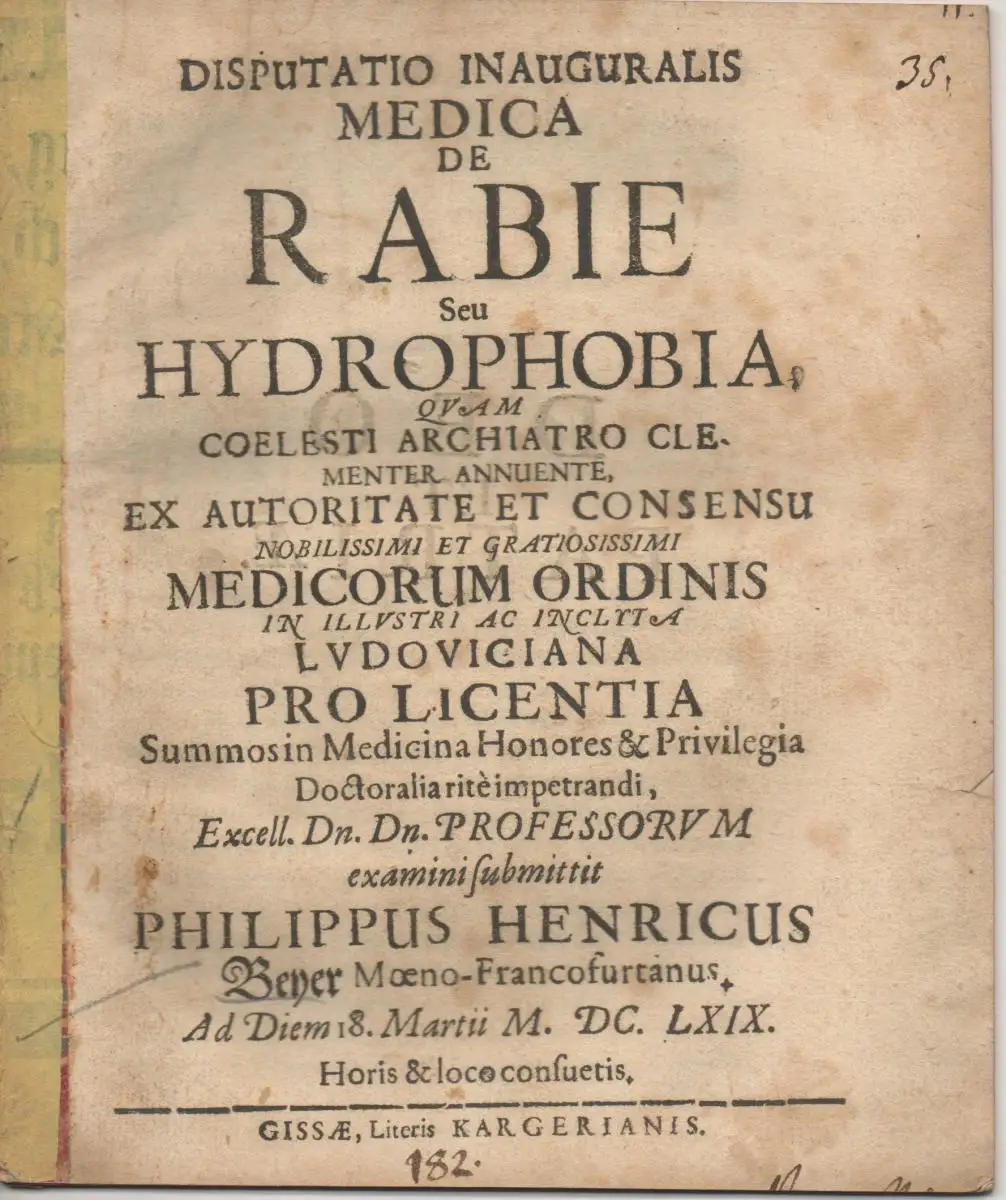 Beyer, Philipp Heinrich: aus Frankfurt/Main: Medizinische Inaugural-Disputation. De rabie seu hydrophobia.
