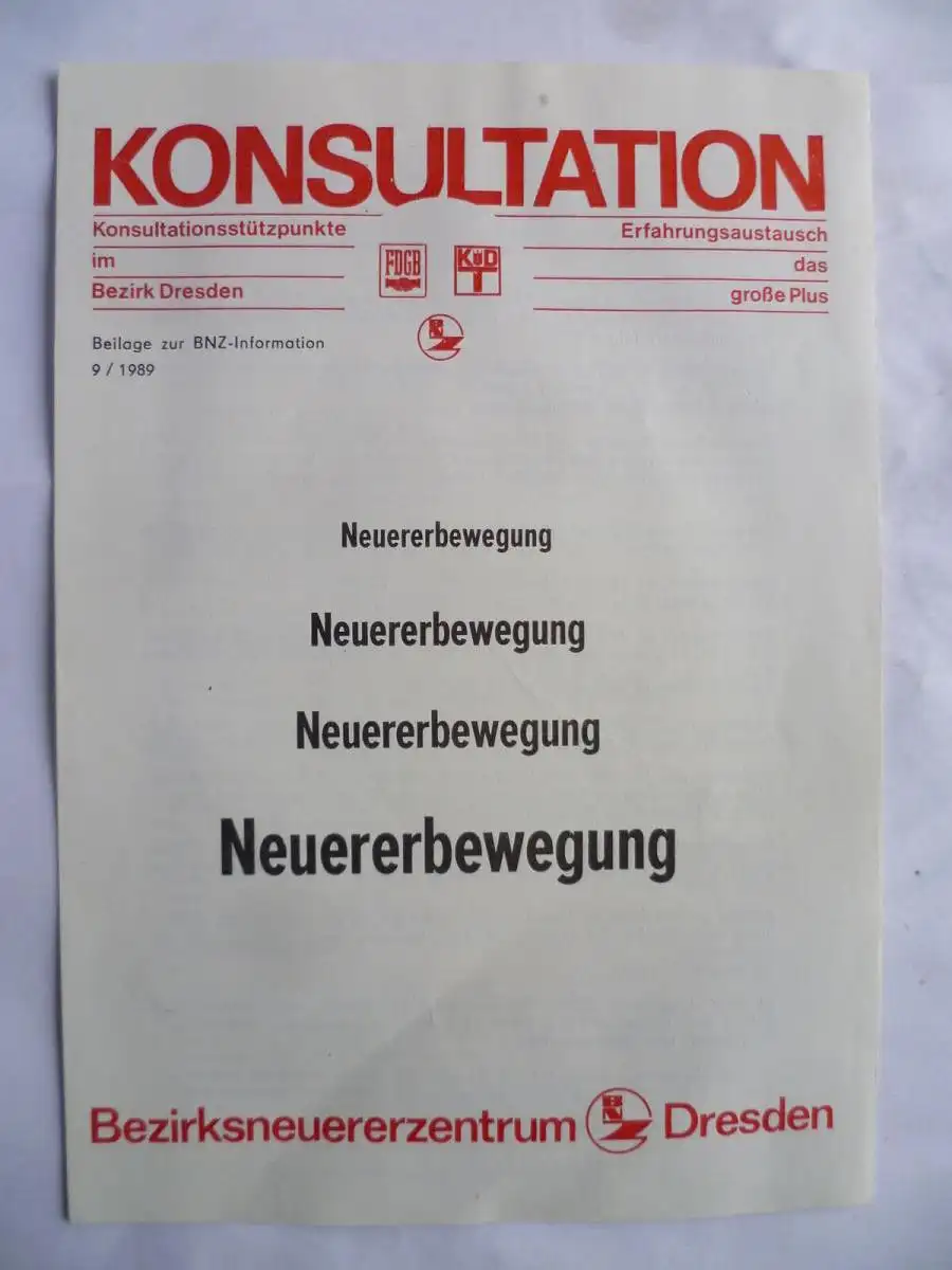 Wohl eine der letzten Ausgaben des Informationsblattes für das Neuererwesen. 6 Seiten ineinander gefaltet, dazu Beilage Konsultation (4 Seiten). Gut erhalten.
