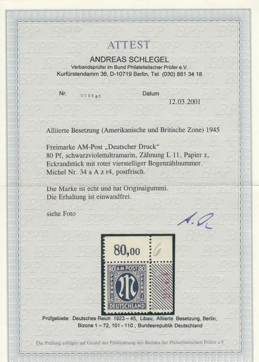 BiZone: MiNr. 34 a A z r4,postfrisch im Eckrand mit Bogenzählnummer, BPP Attest