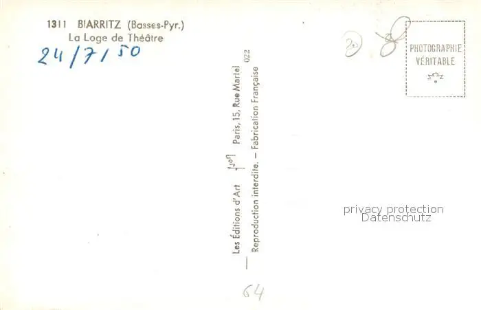 Biarritz_Pyrenees_Atlantiques La Loge de Theatre Biarritz_Pyrenees postalisch nicht gelaufen 1950 Erhaltung siehe scans [LiesaD40] LiesID40