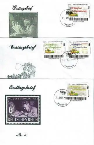 • MichSeite Biberpost: 31.01.2009, "Winkelfred's Sammelsurium", Satz, Typ VI, FDC Beschreibung \nAusgabeland: Bundesrepublik Deutschland \nPostdienstleister: Biberpost, Magdeburg \nAusgabeanlass: personalisierte Briefmarkenausgabe "Winkelfred's Sammelsurium" Katalognummer: - Ausgabedatum: 31.01.2009, 18.02.2009, 21.03.2009 Nominale: Satz (4 Werte) zu 0,42 EUR, 0,84 EUR, 1,16 EUR, 1,79 EUR \nTyp: VI (altes Logo) \nErhaltung: selbstklebend, gerade gestanzt, Ersttagsbrief (FDC) \nHinweis: -