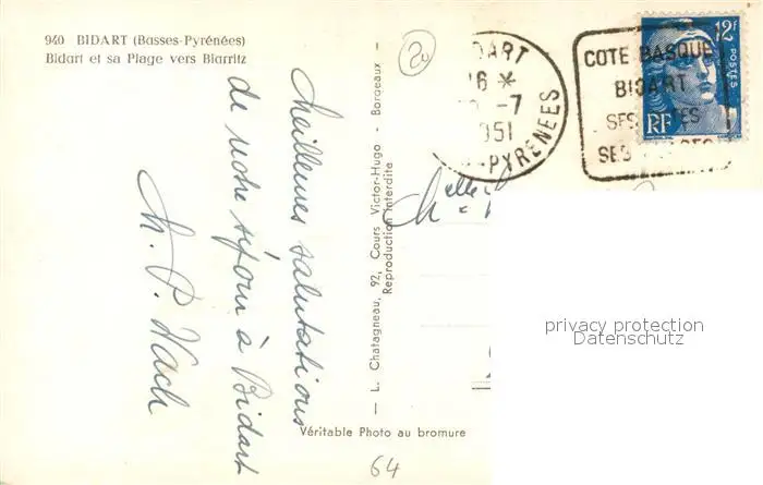 Bidart Plage Bidart postalisch gelaufen 1951 Erhaltung siehe scans [LiesaD40] LiesID40