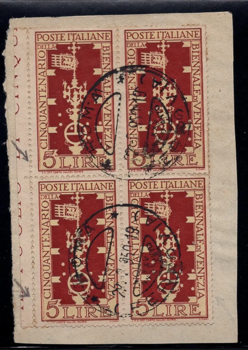 Gebraucht - Biennale von Venedig 5 Lire Nr. 594 Viertel gebraucht auf Fragment, ein Exemplar mit Übertragungsvarianten acht statt sieben Sternen (Sass. n. 594a) - Schön und ungewöhnlich - Kat. euro 350 Cod. 3393/WEB