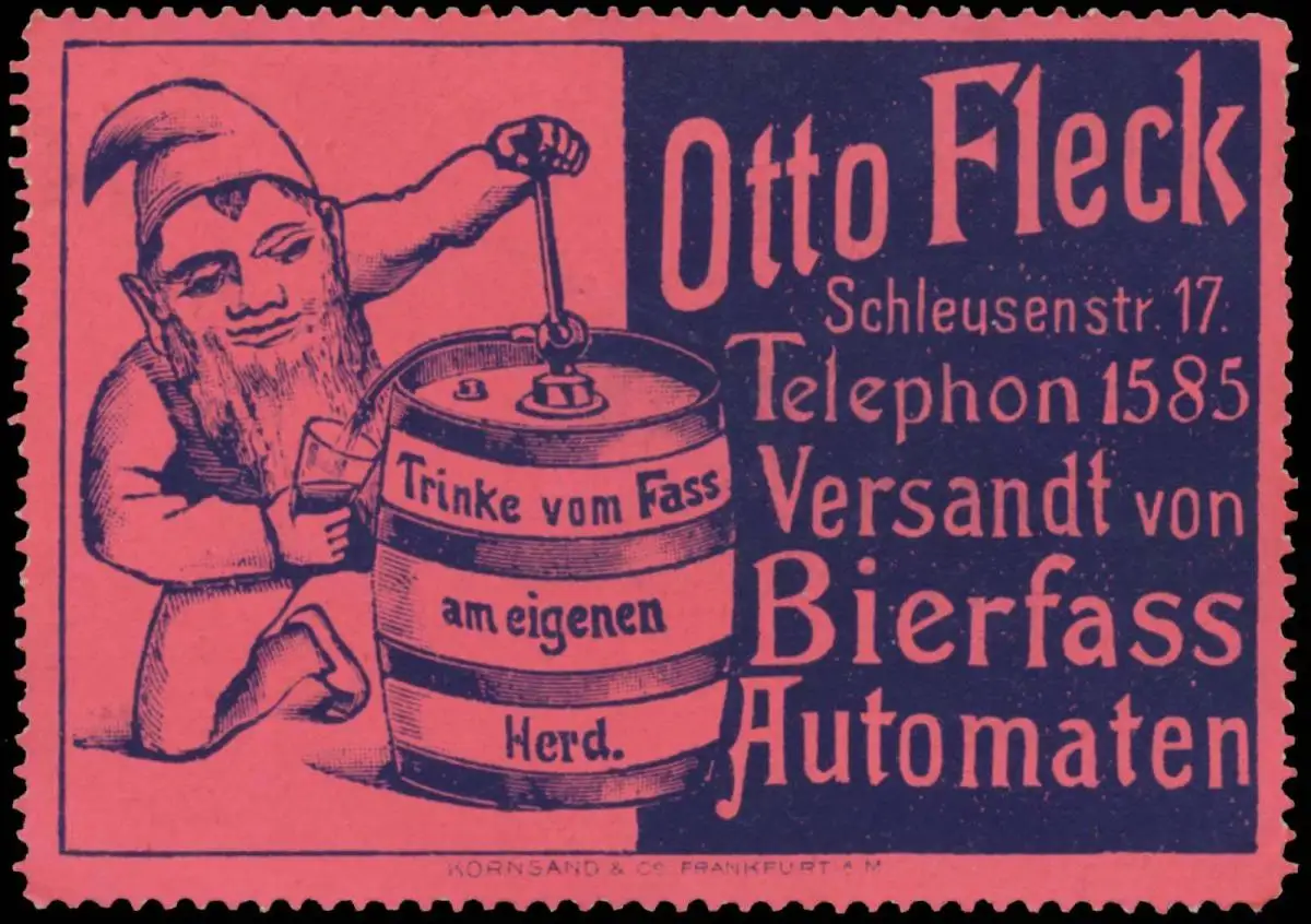 Trinke vom Fass am eigenen Herd. Zwerg, Größe/Zustand: 5x7 , leicht beschädigt, Original alte Reklamemarke die seinerzeit für die Werbung benutzt wurde