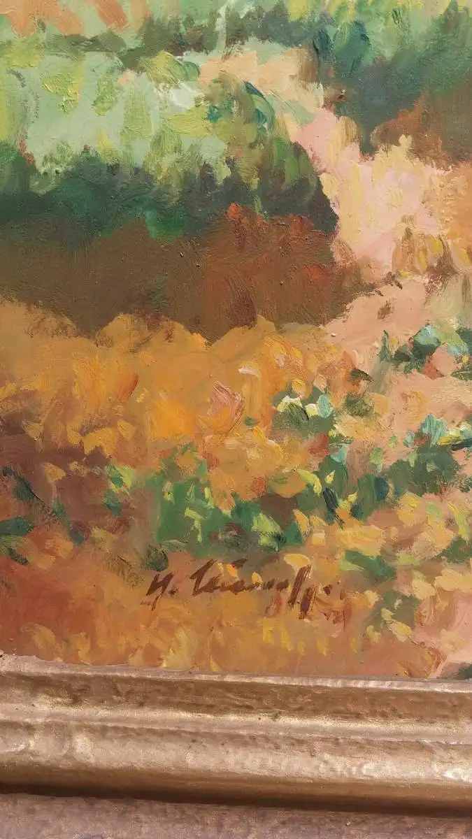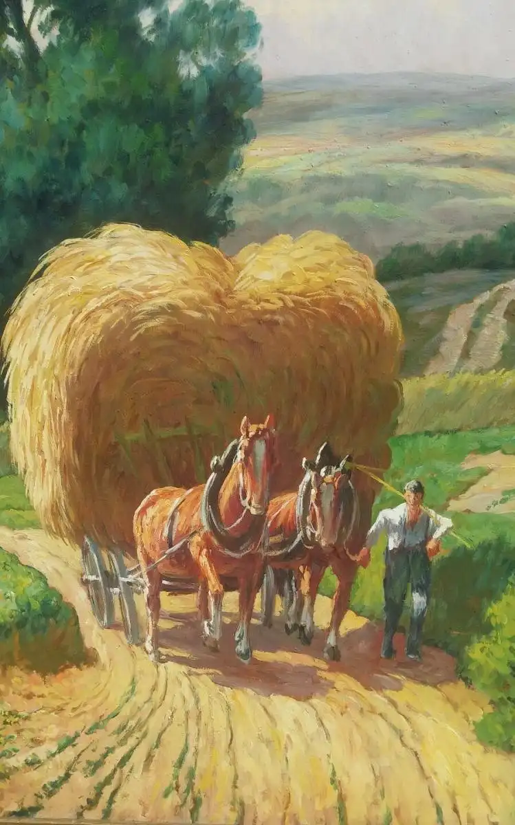 Öl auf Hartfaser. Bauer mit Pferdewagen bei der Heuernte. Sehr schön gemalt, ca 50 x 60 cm groß ( 63 x73 ) unten links signiert, leider für mich nicht zu entziffern. In einem alten Goldrahmen.