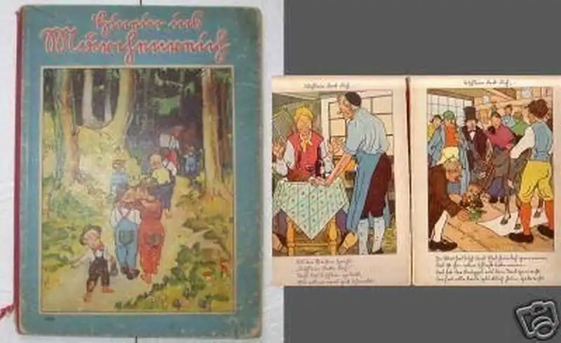 "Hinein ins Märchenreich" ein sehr hübsches Bilderbuch aus der Zeit um 1940 Tischlein Deck Dich!, Der Wolf und die 7 Geißlein und Der gestiefelte Kater werden auf je 1 Doppelseite in 2 ganzseitigen farbigen Bildern mit Reimen vorgestellt gelesen (Seiten lose, Altersspuren), siehe Bild