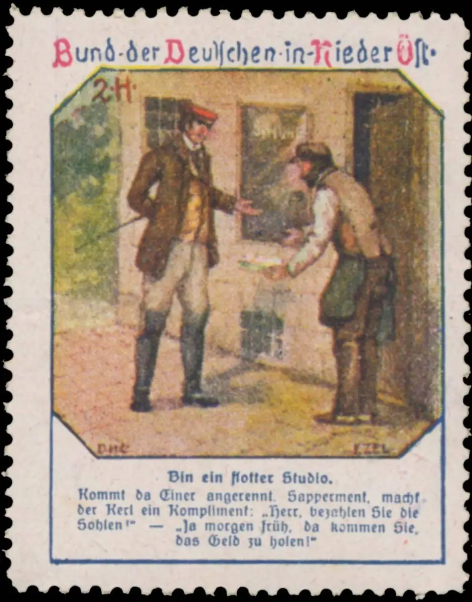 Kommt da einer angerennt. Sapperment, macht der Kerl ein Kompliment: Herr bezahlen Sie die Sohlen! - Ja morgen früh, da kommen Sie, das Geld zu holen. , Größe/Zustand: 5x4 , guter Zustand, Original alte Reklamemarke die seinerzeit für die Werbung benutzt wurde