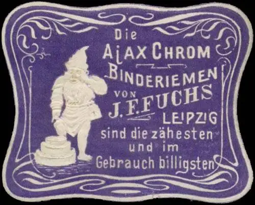 Die Ajax Chrom Binderiemen von J.F. Fuchs sind die zähesten und im Gebrauch billigsten. Zwerg, Größe/Zustand: 4x5 , guter Zustand, Original alte Reklamemarke die seinerzeit für die Werbung benutzt wurde