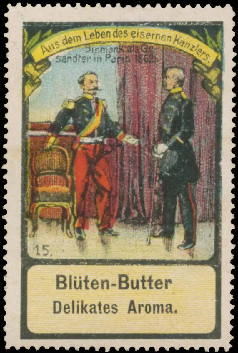 Aus dem Leben des eisernen Kanzlers Otto von Bismarck, 15, Blüten-Butter delikates Aroma, Größe/Zustand: 6x4 , guter Zustand, Original alte Reklamemarke die seinerzeit für die Werbung benutzt wurde