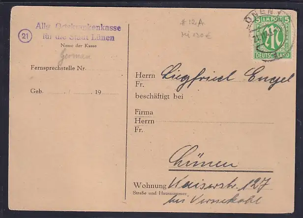 Bizone, AM Post Fernkarte mit EF. Mi.-Nr. 12 A