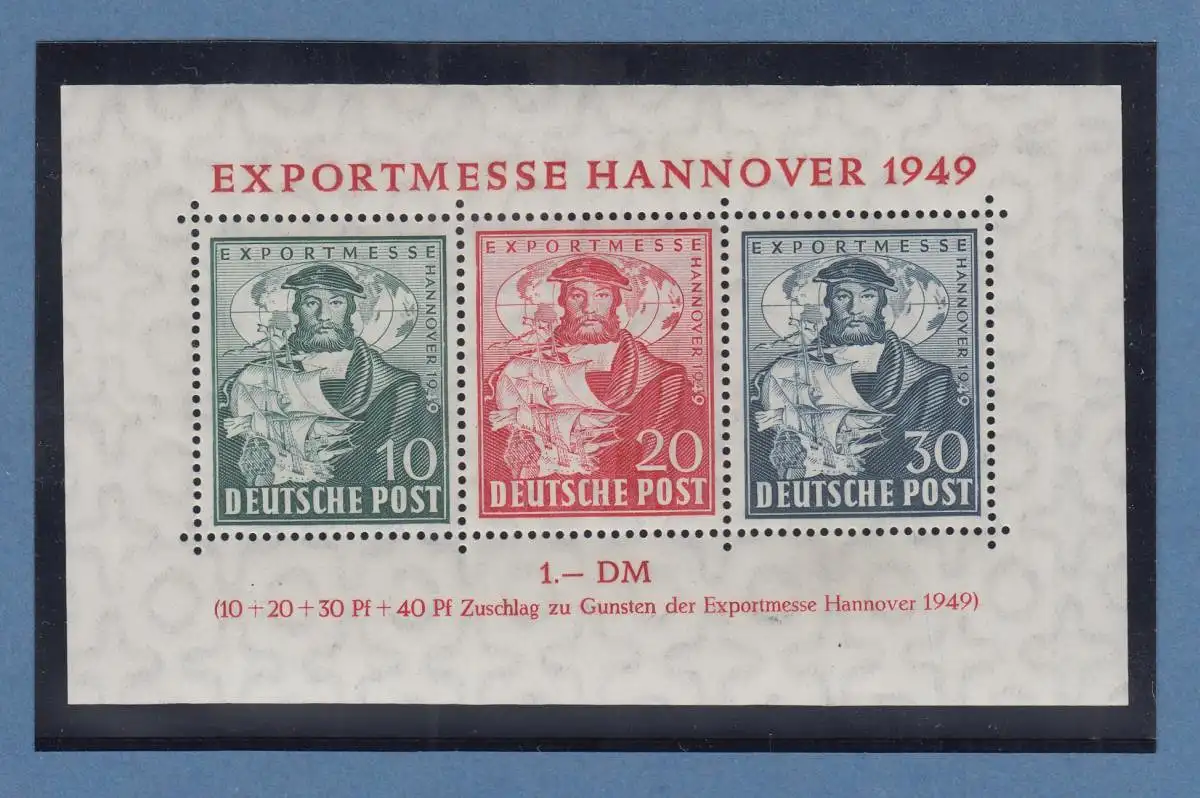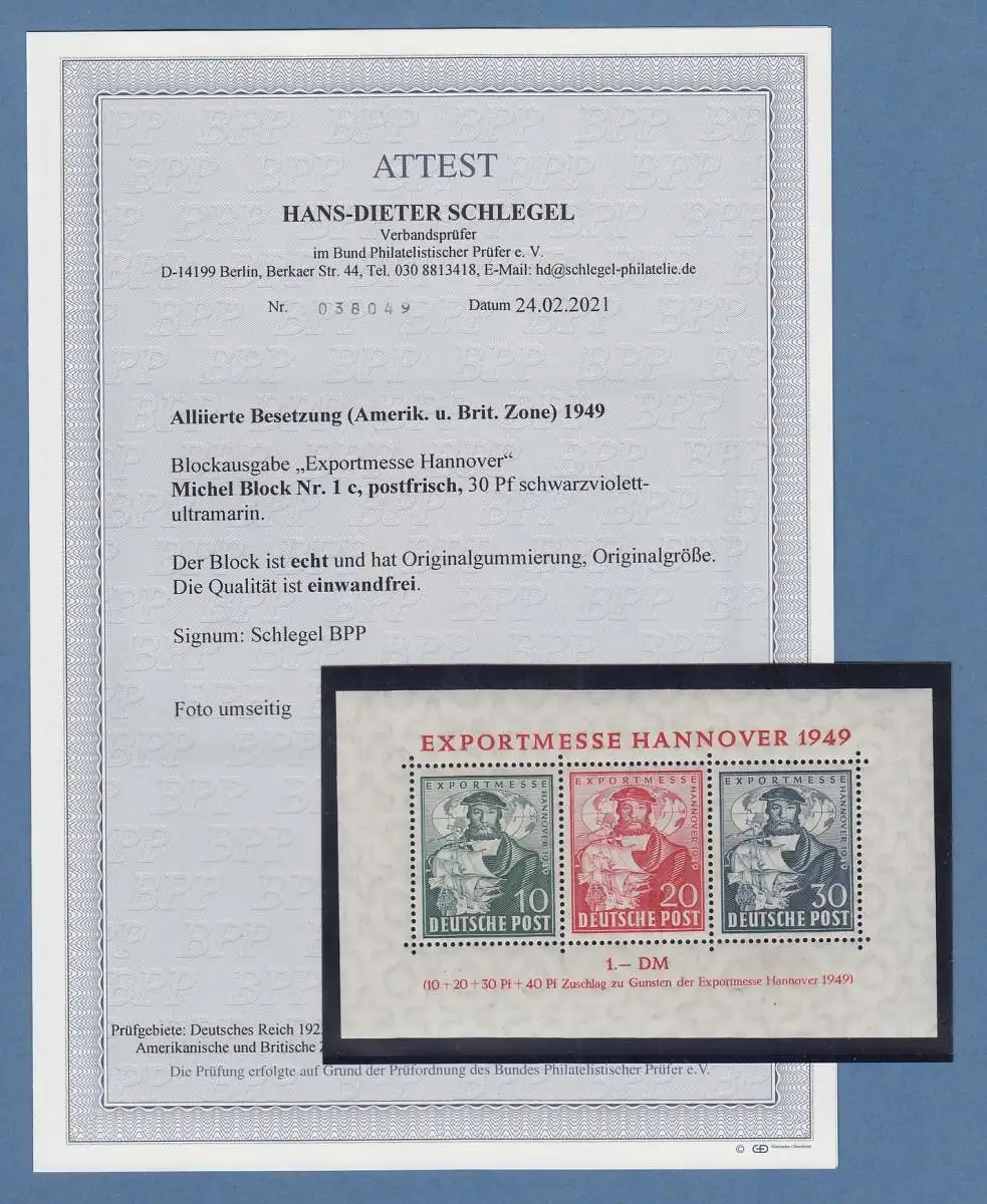 Bizone Hannover-Messe Block seltene c-Farbe Mi.-Nr. Block 1 c ** Attest Schlegel