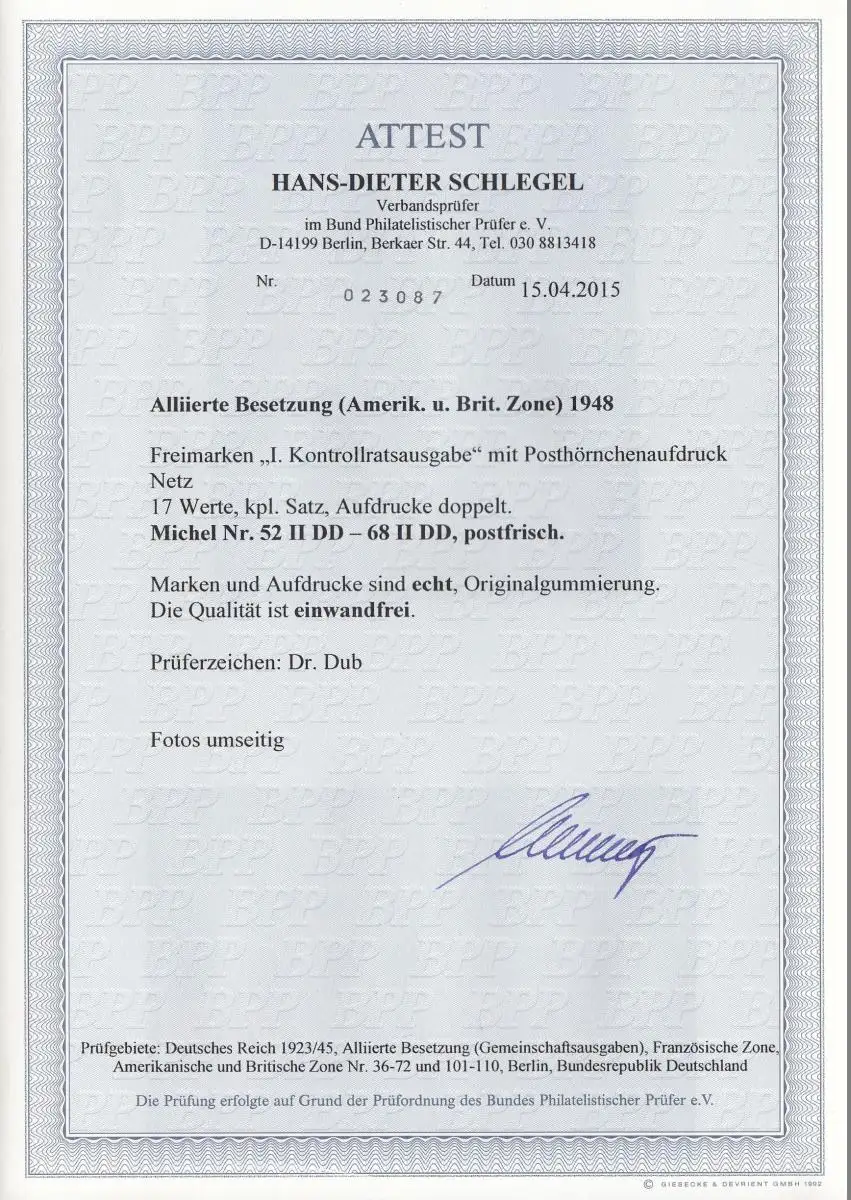 Bizone: MiNr. 52-68 II DD, postfrisch, ** mit BPP Attest
