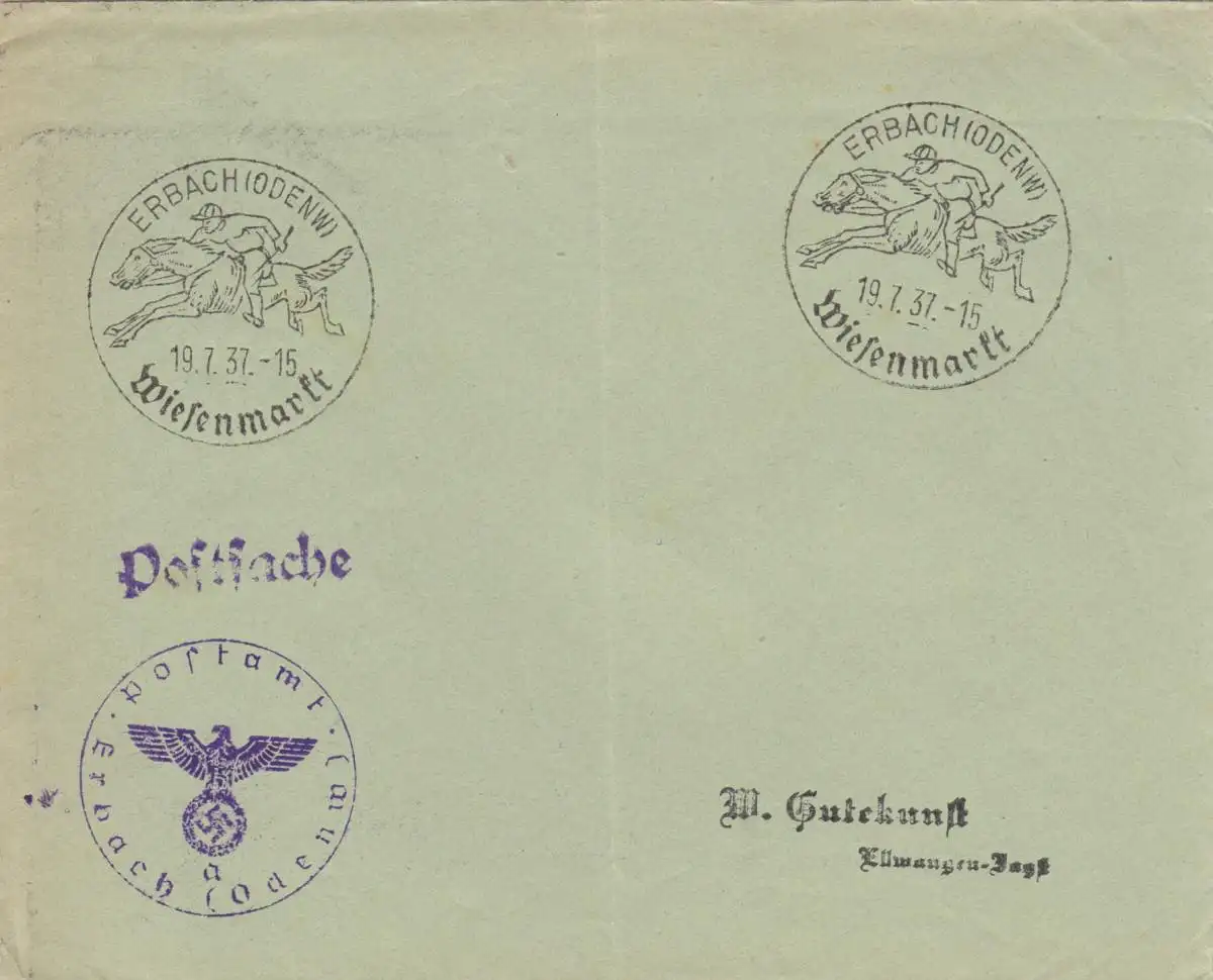 Blanko Kuvert 1937: Wiesenmarkt Erbach /Odenwald, Reiter, Jockey, Pferd