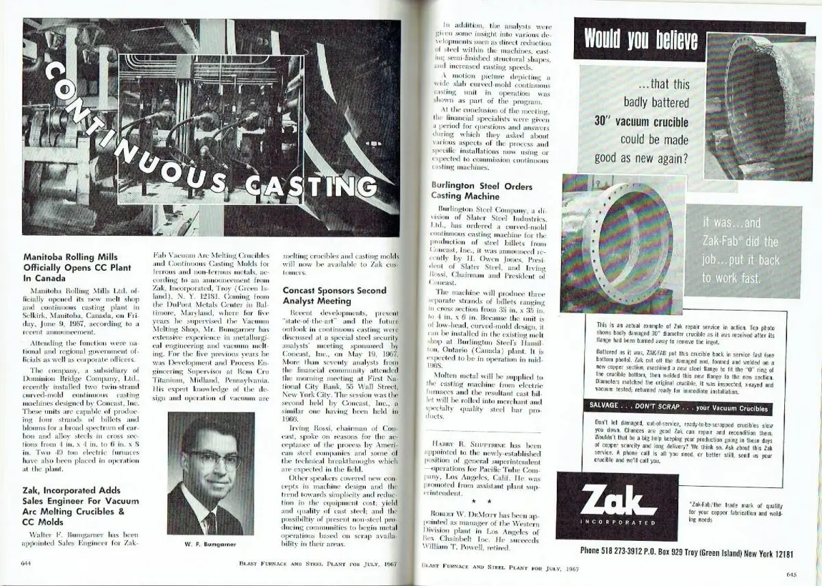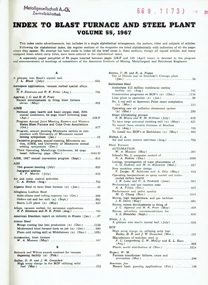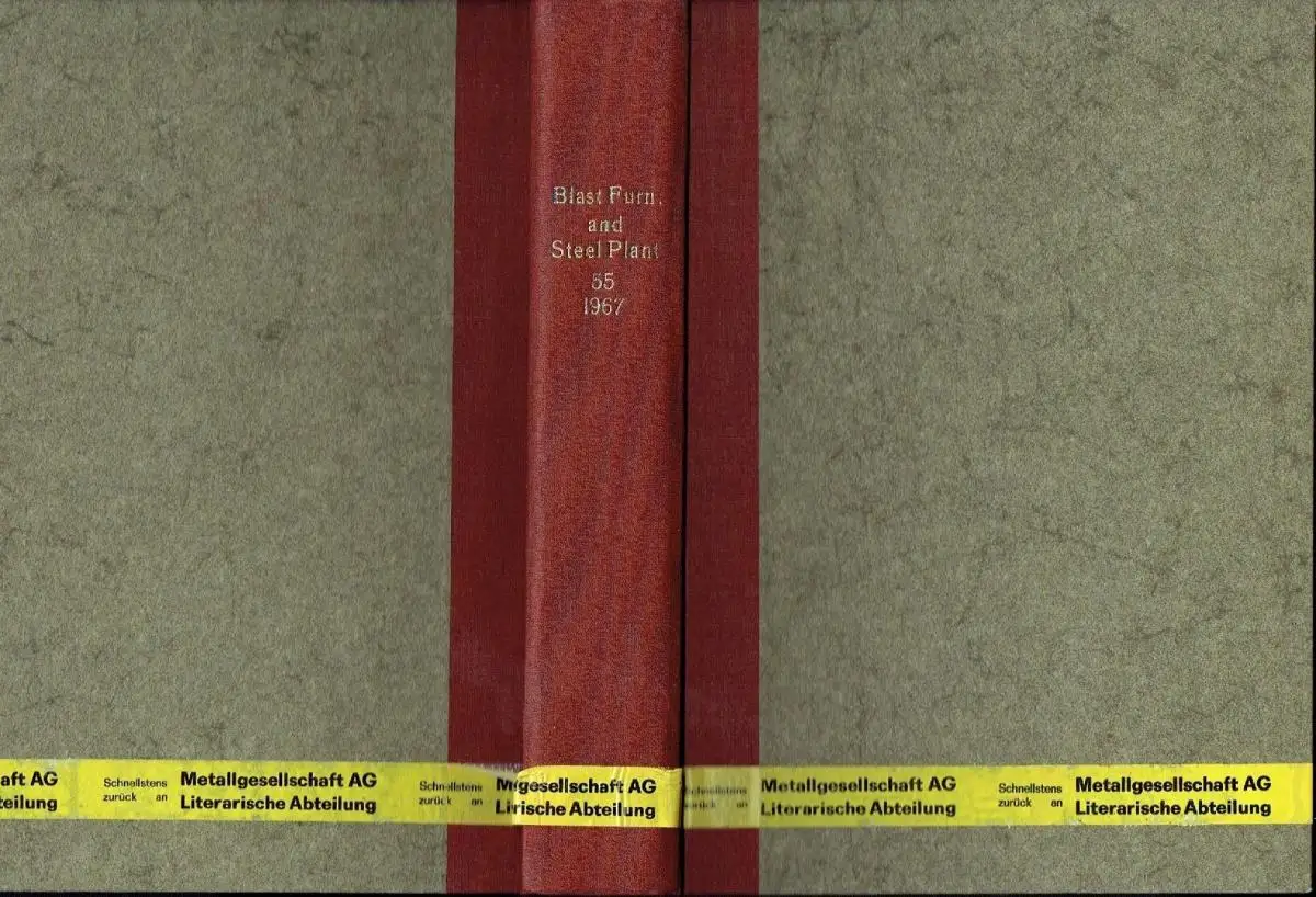 guter Zustand, Gebrauchs- und Alterungsspuren: Einband mit schmalem Aufkleber ringsherum - Inhaltsverzeichnis und Vorsatz mit alten Bibliotheksstempeln - Deckel innen mit angeklebtem Papierrest und oberflächlich gering beschädigt - Seiten sauber und ordentlich, A glimpse into Steel's crystal ball - J. L. Block (July) - Aerospace applications, vacuum melted special alloys for - R. P. Simmons and R. K. Pitler (Aug.) - Agarwal, J. C. and H. R. Pratt - Recent developments in firing blast furnace stoves (May) - AIME - National open hearth and basic oxygen steel, 50th annual conference, 84 page insert following page (Apr.) - Program Annual Joint Meeting Eastern and Western States Blast Furnace and Coke Oven Associations (Oct.) - Program, annual meeting Minnesota section in conjunction with University of Minnesota annual mining symposium ( Jan.) - Tentative program, annual meeting, Minnesota section, AlME, and University of Minnesota annual mining symposium (Dec.) - Third Operating Metallurgy Conference, 64 page insert following page (Nov.) - AISE, 1967 annual convention program (Sept.) - AISI - 75th general meeting (July) - Inaugural address - E. F. Martin (July) - Air and water control activities - C. A. Bishop (Aug.) - Algoma Steel to have blast furnace (n) (Jan.) - Allegheny Ludlum Steel - Adds silicon steel rolling capacity (n) (Oct-) - Orders rod and bar mill (n) (Sept.) - Starts L-D plant (n) (May) - Alloys, vacuum melted, for aerospace applications - R. P. Simmons and R. K. Pitler (Aug.) - American Steelmen report on industry in Russia ( Jan.) - Armco Steel - Brings coating line into production (n) (Dec.) - Modernized blast furnace back on job (n) (Oct.) - Plans cold rolling mill at Middletown (n) (Nov.) - Automation, blast furnace - W. A. Munson (May) - Babcock and Wilcox awards contract for vacuum degassing facility (n) (Feb.) - Bailey, D. R. and J. W. Onuschek - High scrap charge in the BOF utilizing solid fuel (Mar.) - Barnes, T. M. and R. A. Nagan - Use of Illinois coal at Interlake's Chicago plant (Jan.) - Bethlehem Steel - Authorizes $13 million continuous casting facility (n) (Aug.) - Construction progresses on BOF's (n) (Dec.) - Lime plant in operation (n) (Jan.) - No. 3 rod mill at Sparrows Point nears completion (n) (Mar.) - Operating new air pollution abatement system (n) (Mar.) - Sheet Chromizing process - E. H. Mayer and R. M. Willison (July) - To have large universal slabbing mill (n) (May) - To install three electric furnaces at Steelton (n) (Aug.) - To install two BOF's at Bethlehem (n) (May) - Bishop, C. A. - Air and water control activities (Aug.) - Blast Furnace - AUTOMATION - W. A. Munson (May) - Inland's No. 5, computer control of N. A. Robins (Dec.) - Linings, investigation of wear phenomena of L. G. Gaffney and M. O. Holowaty (Mar.) - New stockline armor design - F. Lenger. H. Schirmer and A. Otto (May) - Operating temperatures on spray cooled and under-cooled carbon hearth - J. R. Lowe and G. A. Prokipik (June) - Performance and low reaction coke - A. A. Triska (Oct.) - Performance and pellet quality - M. C. Chang (Nov-) - Stoves, high temperature, and gas turbines - J. K. Davis (May) - Stoves, recent developments in firing of J. C. Agarwal and H. R. Pratt (May) - Stoves, refractory recommendations for L. L. Sheatsley (Sept.) - Block, J. L. - A glimpse into steel's crystal ball (July) - BOF - High scrap charge in, utilizing solid fuel - Bailey, D. R. and J. W. Onuschek (Mar.) - Manufacture of stainless steel in F. C. Langenberg, C. W. McCoy and E. L. Kern (Aug.) - Plants, world distribution of (Nov.) - Bogert, W. M. - Furnace transformer failures, cause and prevention (Mar.) - Bowman, Jan - Recent basic gunning applications (Feb.) - and many others, Halbkunstleder, ca. 21 x 28,5, 1158 Seiten mit zahlreichen Bildern