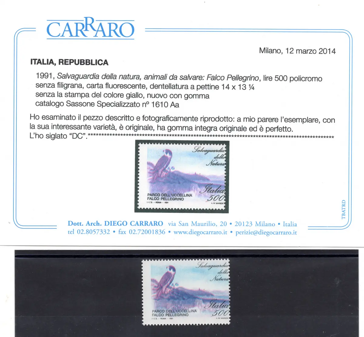 MNH Vollgummi - Naturschutz Lire 500 Blaufalke Nr. 1978 ohne Blaudruck - Naturmarke - (Sächsische Spec. 1610Aa) - Cert. Carraro Cod. 874/5
