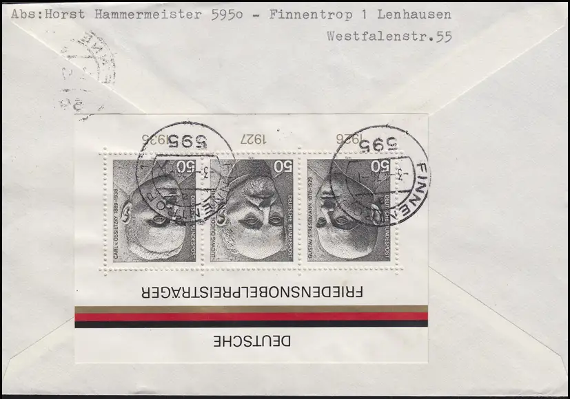 Block 11 Friedensnobelpreisträger mit Unfall 40 Pf MiF R-Brief FINNENTROP 3.4.76