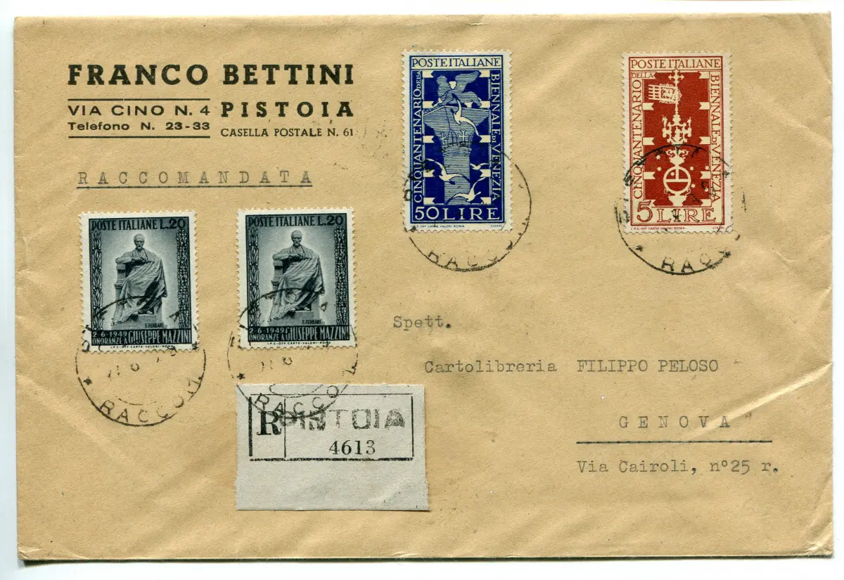 Umschlag - Mazzini Nr. 604 zwei Exemplare + Ergänzungen Nr. 594 + 597 auf Umschlag Racc. für Genua am 27.6.48 Cod. 261/13