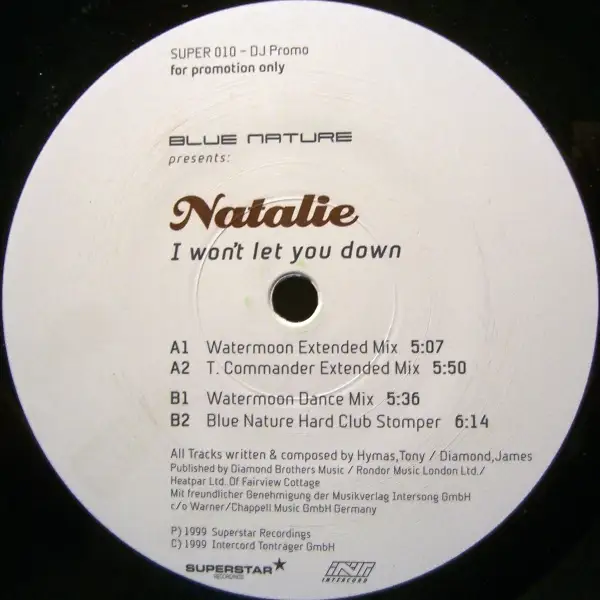 12" Maxi Blue Nature feat. Natalie - I Won't Let You Down, neutrales Cover, Promo, Zustand Platte M- Hülle M-; Made in Germany 1999 Superstar SUPER 010, Tracks Watermoon Ext. Mix 5:07, T. Commander Ext. Mix 5:50, Watermoon Dance Mix 5:36, Blue Nature Hard Club Stomper 6:14