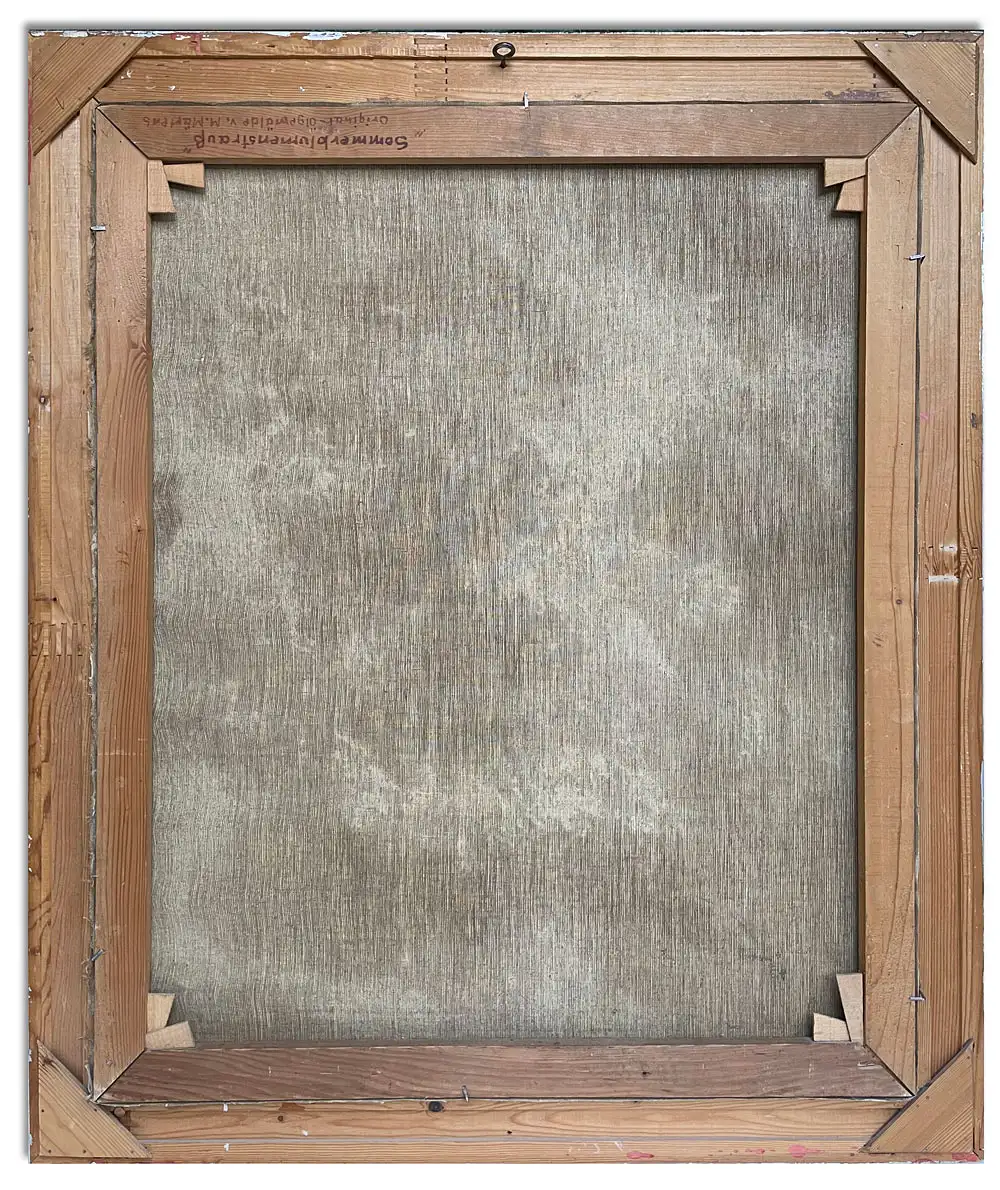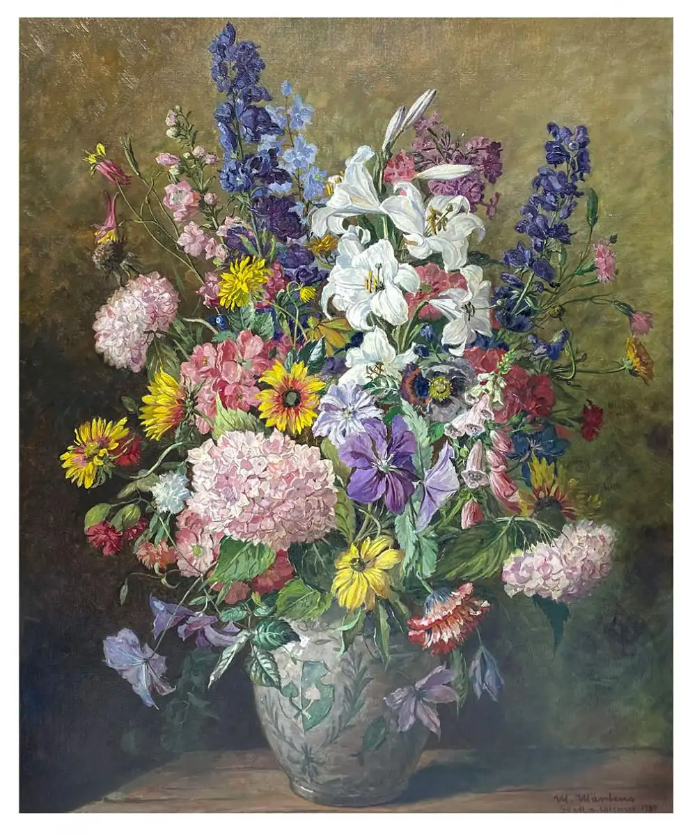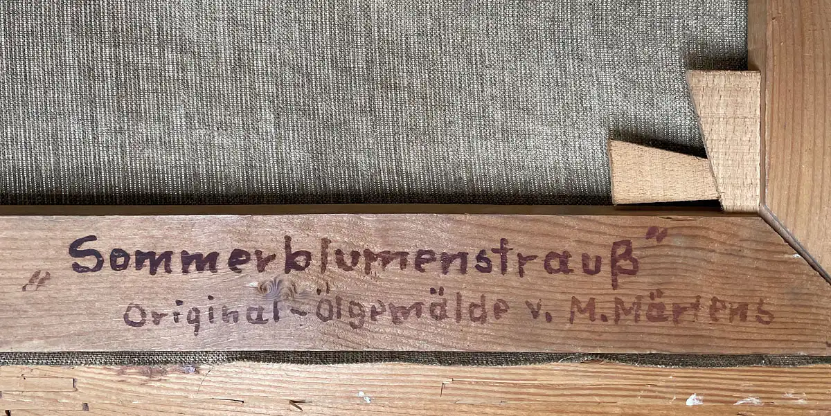 Öl a./Lwd., 80 x 60 cm. Rechts unten signiert, ortsbezeichnet „ Gstadt a. Chiemsee“ und datiert „1949“. Originalrahmen aus der Zeit. Maße mit Rahmen: 93 x 73 cm. Rückseitig auf dem Keilrahmen handschriftlich bezeichnet „Sommerblumenstrauß“. Original-Ölgemälde v. M. Märtens.